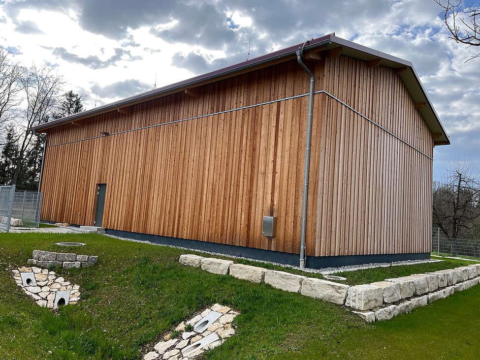 1 Gebäude 21,1 m x 11,80 m, Höhe 7,80 m | 2 x 300 m³ Rundbehälter in Edelstahltankbauweise je ca. 8 m Durchmesser und 6,60 m Höhe