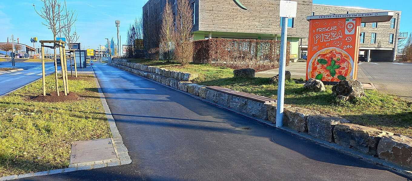 Ein 3,50 m breiter Geh- und Radweg auf der Ostseite ermöglicht komfortables Radfahren und Gehen in beiden Richtungen. Getrennt durch großzügige Grünstreifen mit Straßenbäumen, Hochbeeten und Sträuchern entsteht eine naturnahe Umgebung. Bei der Freiflächengestaltung wurde besonderes Augenmerk auf arten- und strukturreiche Wiesen- sowie Staudenflächen gelegt. Auch auf der Westseite wurden extensive Grünflächen mit Straßenbäumen angelegt.